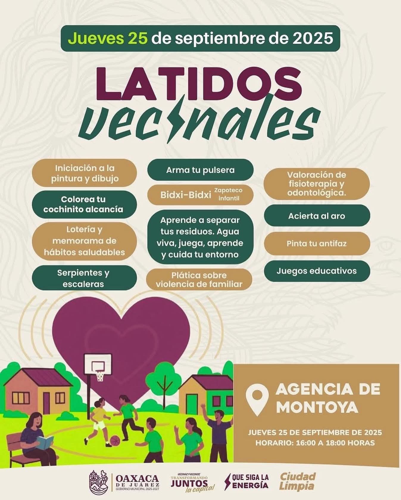 El Ayuntamiento de Oaxaca de Juárez, encabezado por el presidente municipal Ray Chagoya, continúa fortaleciendo la convivencia y el bienestar ciudadano a través de Latidos Vecinales, programa que cada semana llega a diferentes puntos de la ciudad con actividades recreativas, culturales y de prevención.