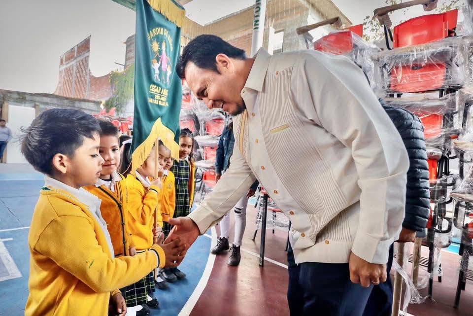 En el municipio de San Pablo Villa de Mitla, con el respaldo de la presidenta Claudia Sheinbaum Pardo y en cumplimiento de compromisos del gobernador Salomón Jara Cruz, el director general del IEEPO, Emilio Montero Pérez, en coordinación con el magisterio entregó, este martes, mobiliario escolar, equipamiento tecnológico, así como material de aseo, deportivo y de oficina a 26 escuelas de nivel básico.