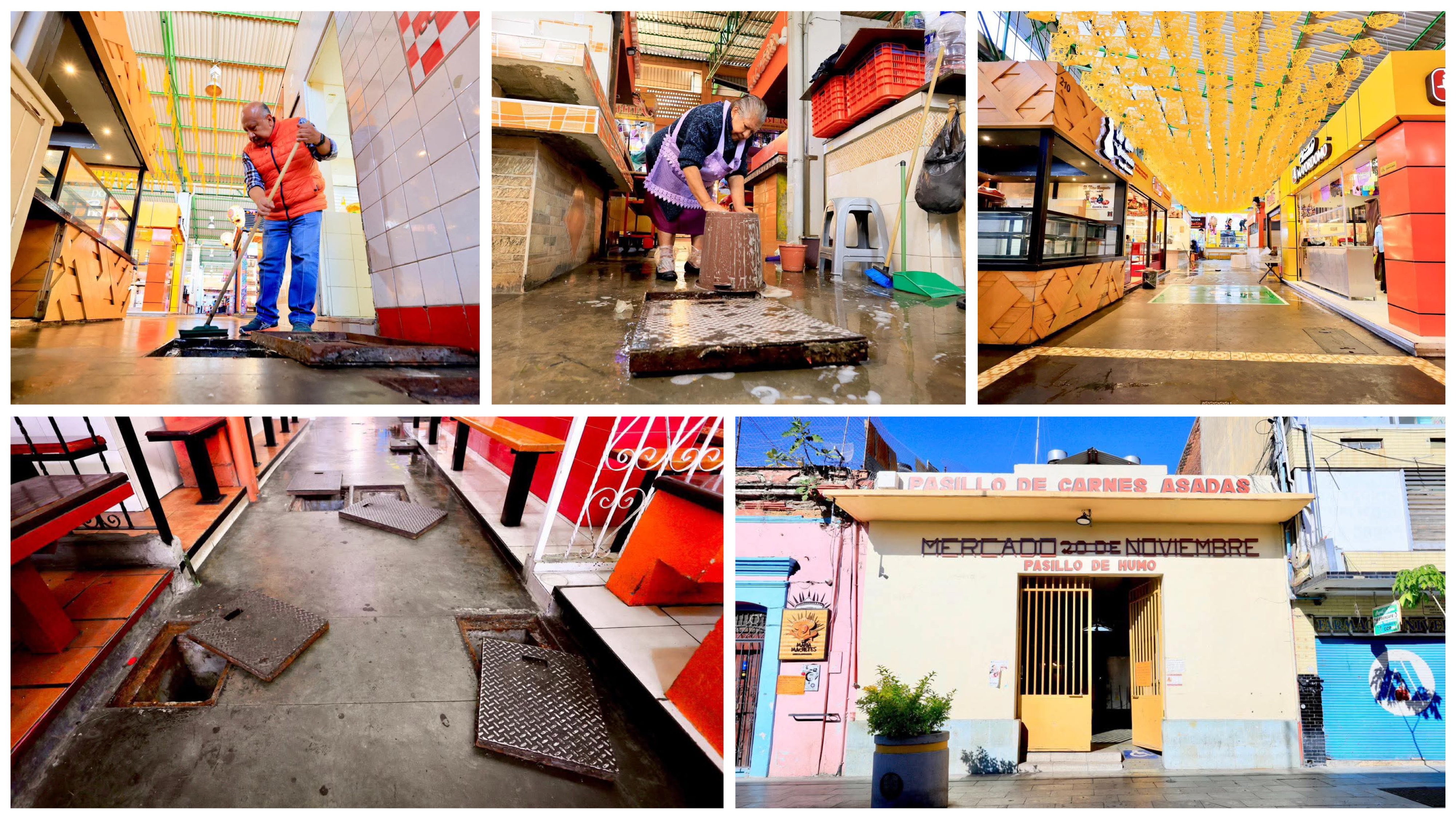 El Municipio de Oaxaca de Juárez, a través de la Secretaría de Gobierno y Territorio y en coordinación con el Sistema Operador de los Servicios de Agua Potable y Alcantarillado (SOAPA), llevó a cabo trabajos de desazolve en el Mercado 20 de Noviembre, uno de los espacios comerciales más representativos de la capital.