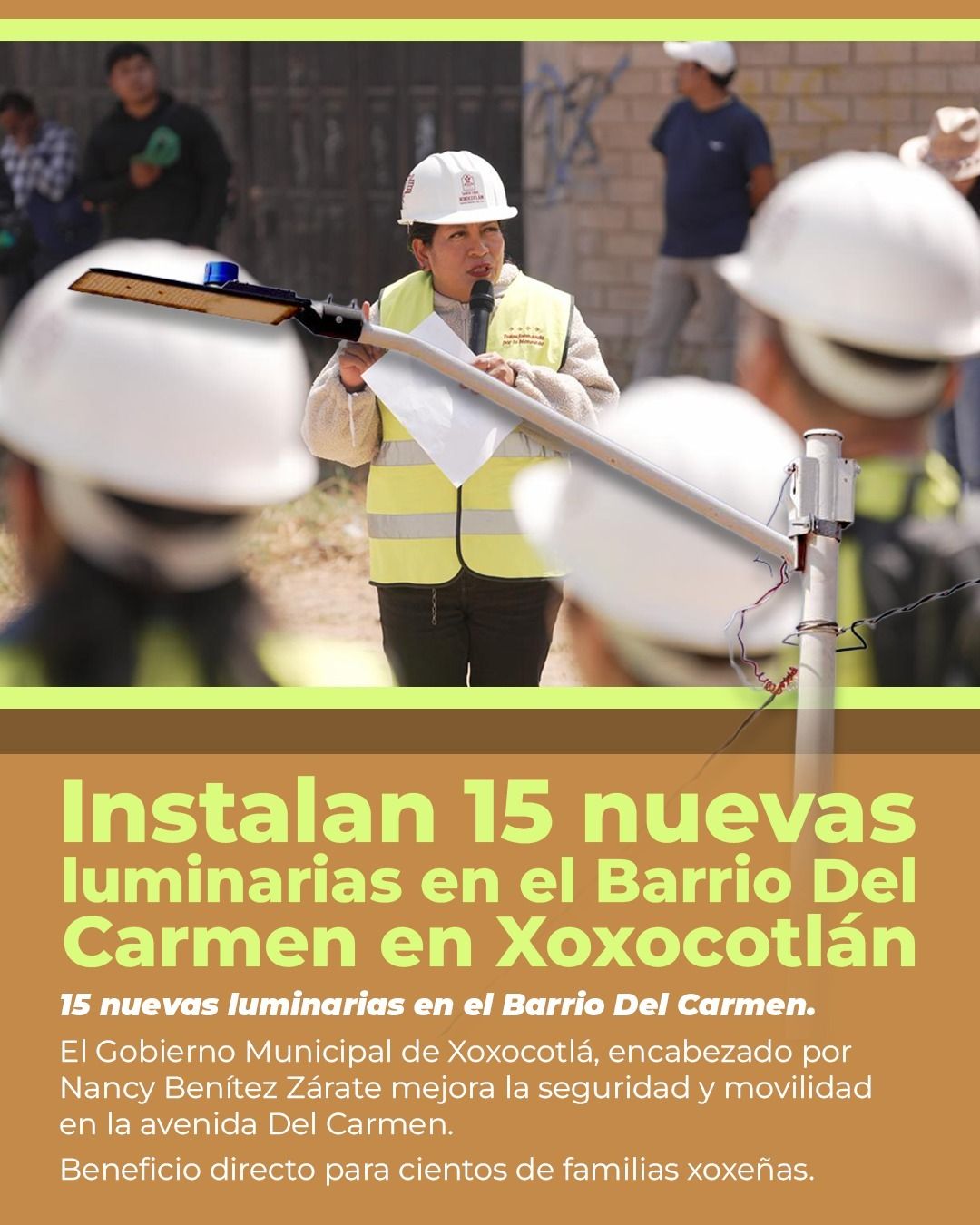 La presidenta municipal de Santa Cruz Xoxocotlán, Nancy Benítez Zárate, entregó 15 nuevas luminarias sobre la avenida Del Carmen, una acción que brinda bienestar a más de 300 familias xoxeñas. Con este apoyo se busca cubrir las necesidades de infraestructura básica en esta importante vía, facilitando el tránsito y mejorando el entorno para las y los habitantes de la zona.