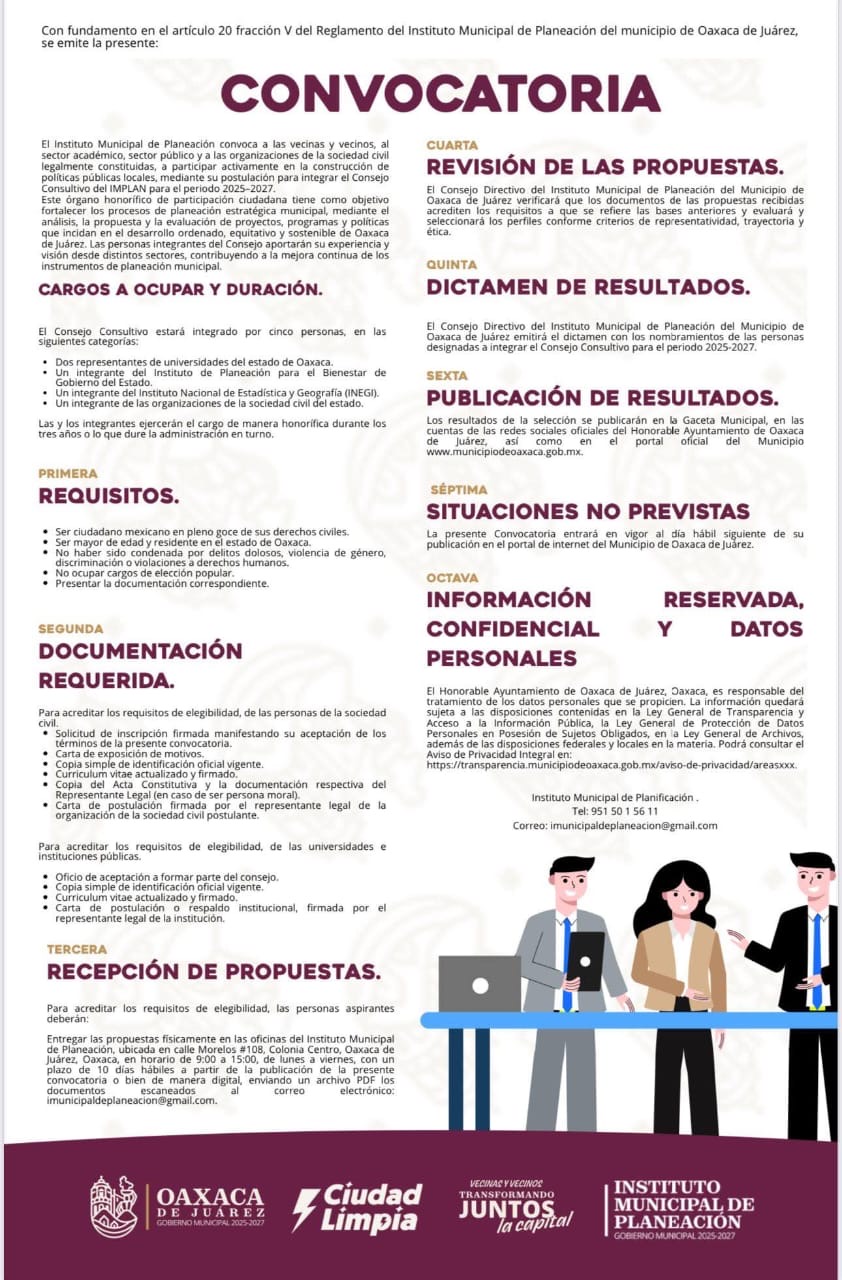El Instituto Municipal de Planeación (IMPLAN) de Oaxaca de Juárez invita a vecinas, vecinos, universidades, organizaciones de la sociedad civil y al sector público a participar en la integración del Consejo Consultivo Temático 2025–2027, un órgano que fortalecerá la participación ciudadana en la construcción de políticas públicas locales.