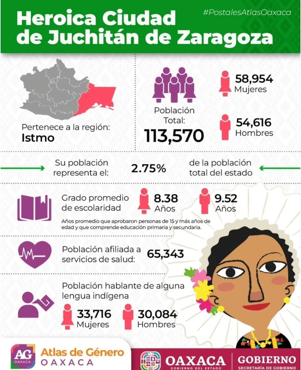 La Secretaría de Gobierno de Oaxaca reconoció que la Heroica Ciudad de Juchitán de Zaragoza es uno de los municipios con mayor relevancia demográfica en la región del Istmo de Tehuantepec, de acuerdo con datos del Atlas de Género Oaxaca.