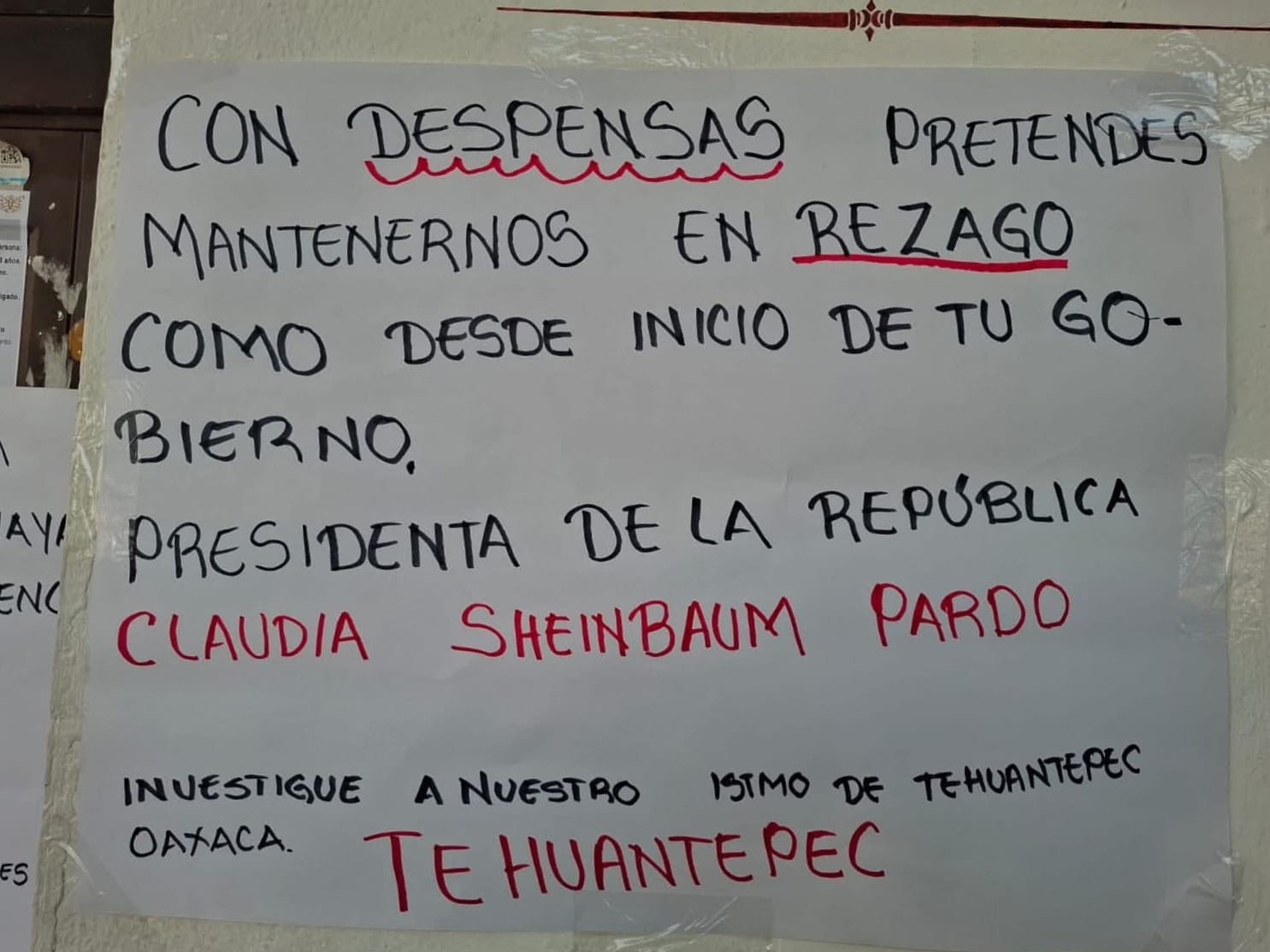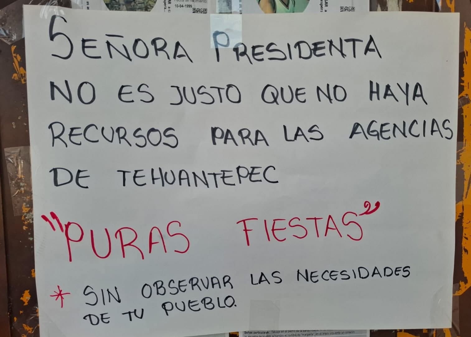 Los inconformes hicieron un llamado al gobierno. En una cartulina dirigida a la Presidenta de la República, Claudia Sheinbaum Pardo, pidieron: "investigue a nuestro Istmo de Tehuantepec". Otra, pegada en la puerta, reclama: "Presidenta, no es justo que no haya recursos para las agencias de Tehuantepec; puras fiestas".